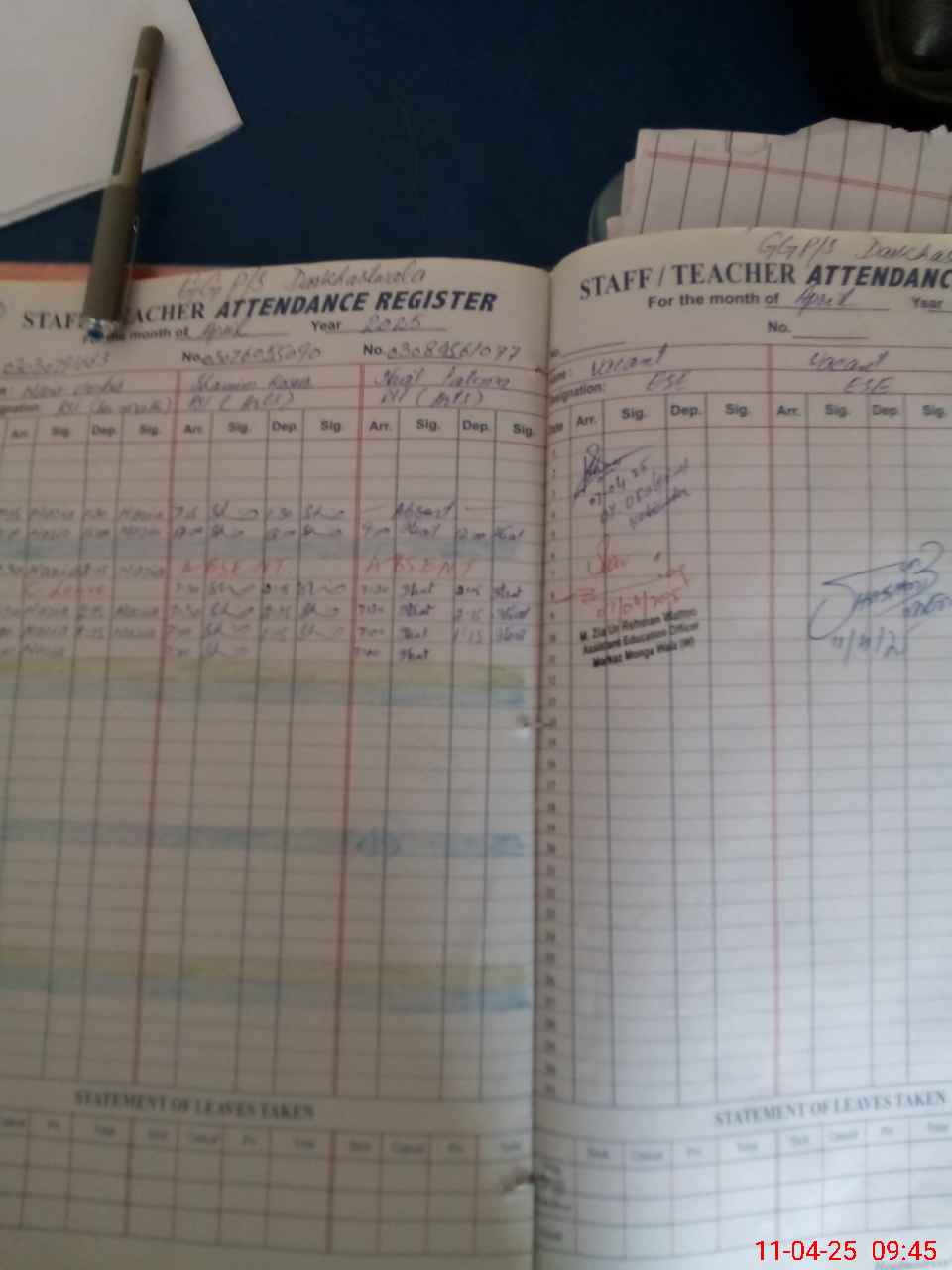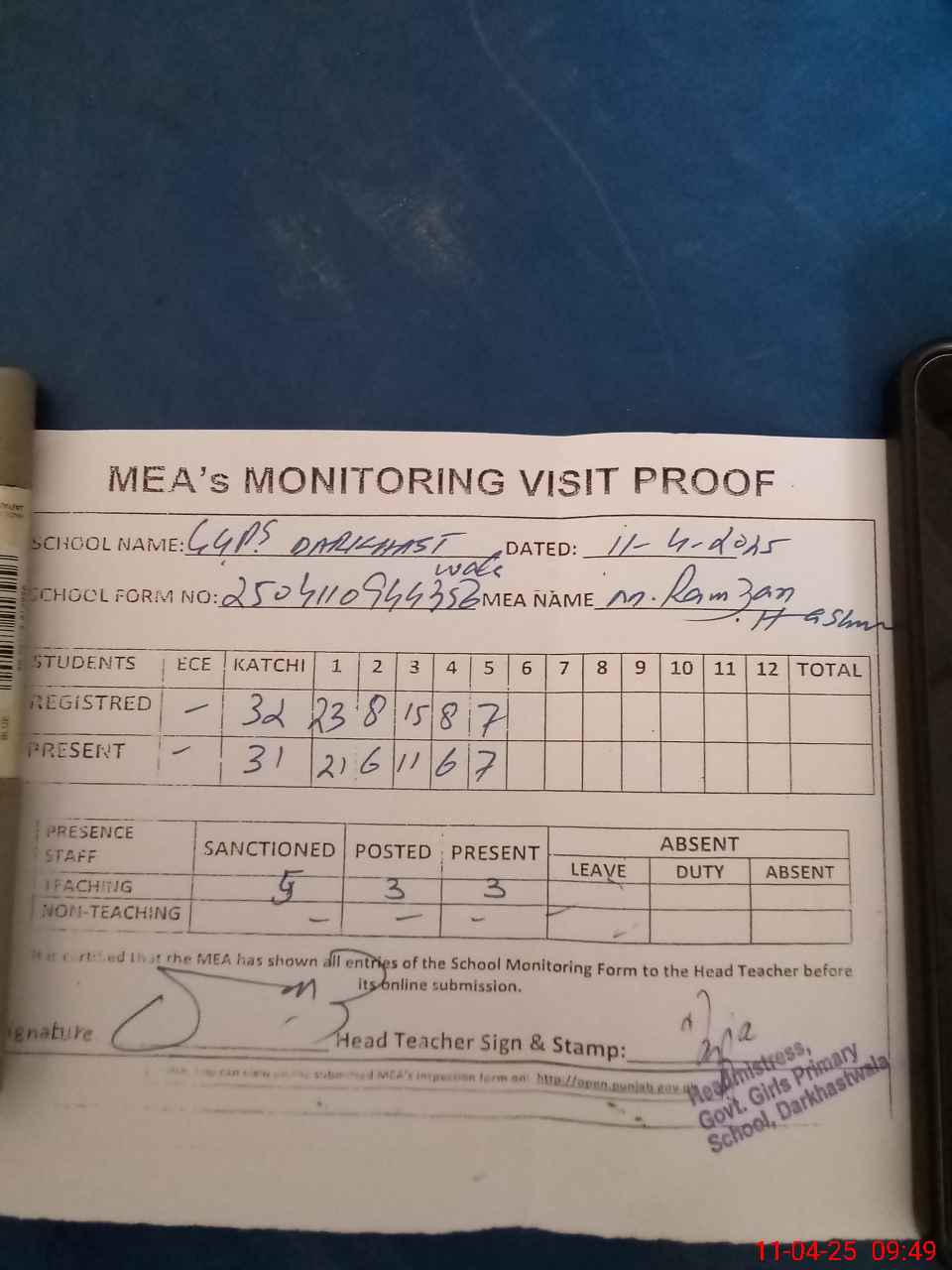 | Attendance Register | Head Teacher | MEA with School | Visit Proof |