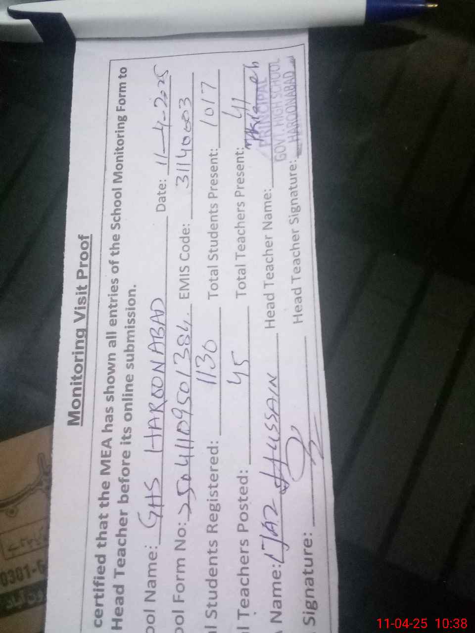 | Attendance Register | Head Teacher | MEA with School | Visit Proof |