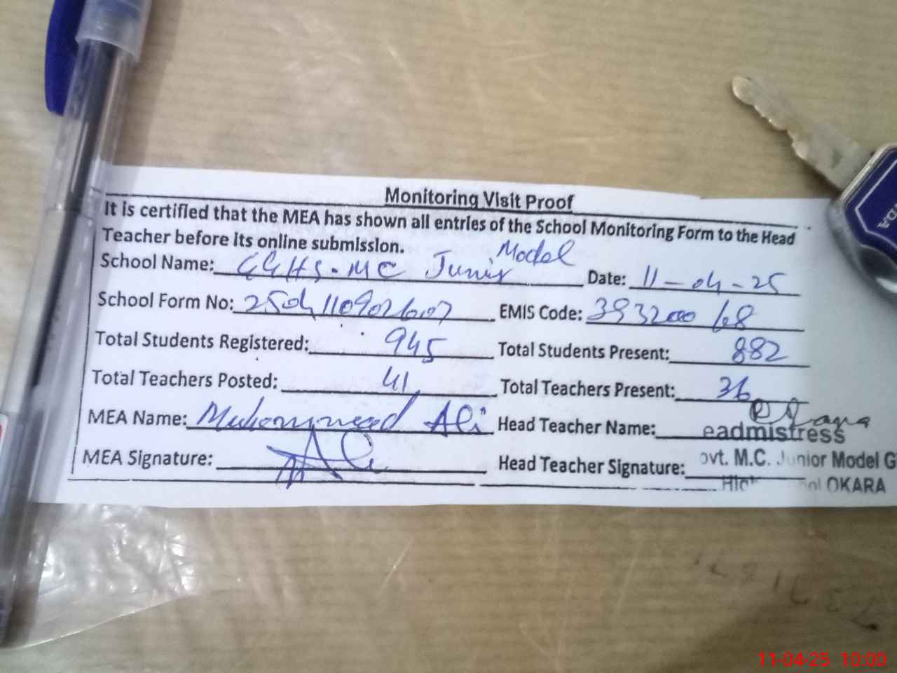 | Monitoring Date: 11-04-2025 | Start Time: 11-04-2025 09:53 AM | End Time: 11-04-2025 10:01 AM | Name of MEA: MO**** AL**** (R**** | |