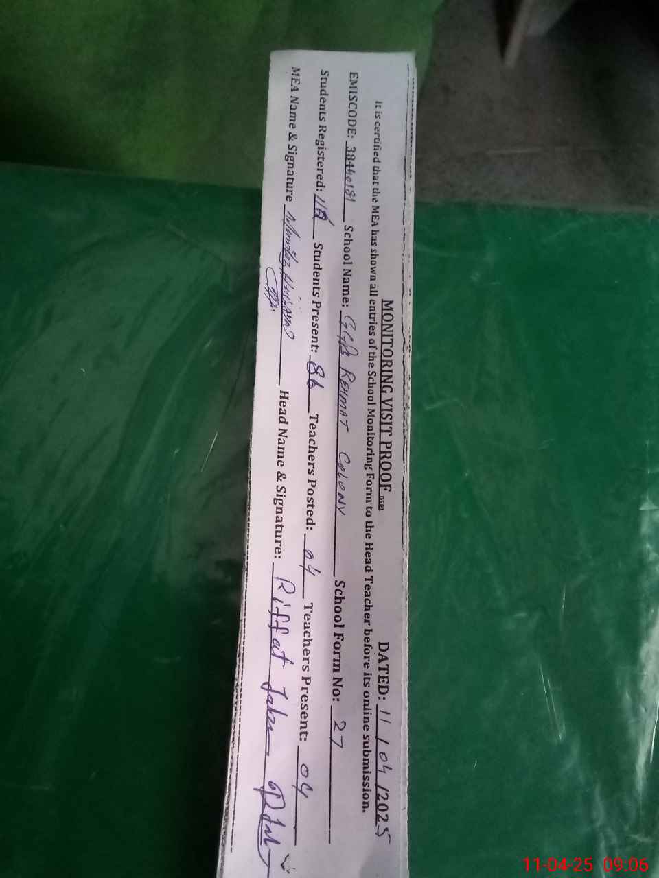 | Attendance Register | Head Teacher | MEA with School | Visit Proof |