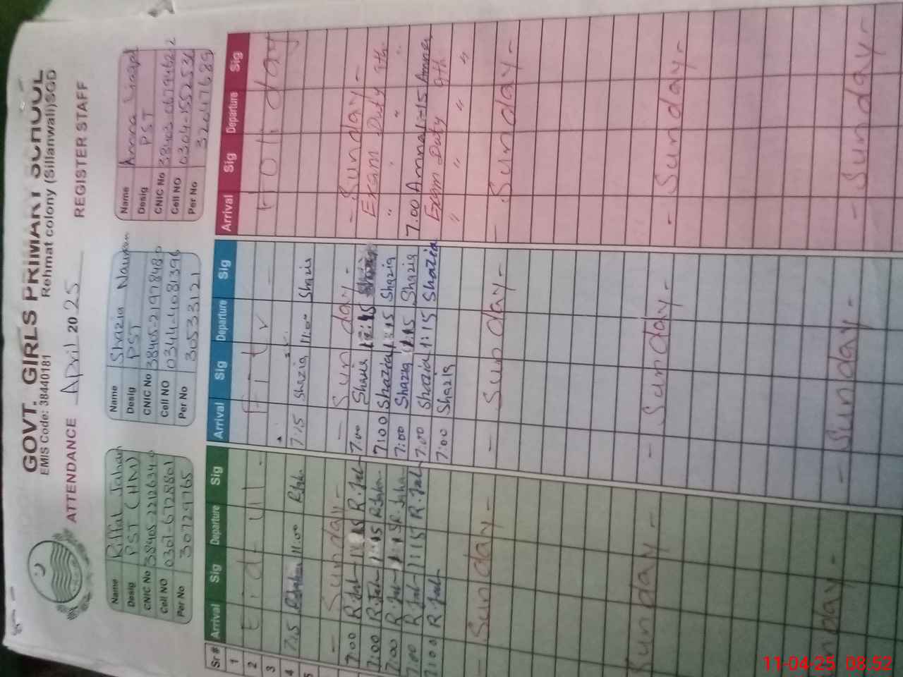 | CNIC | Full Name | Designation | R/C | Absence During Last Calender Month |