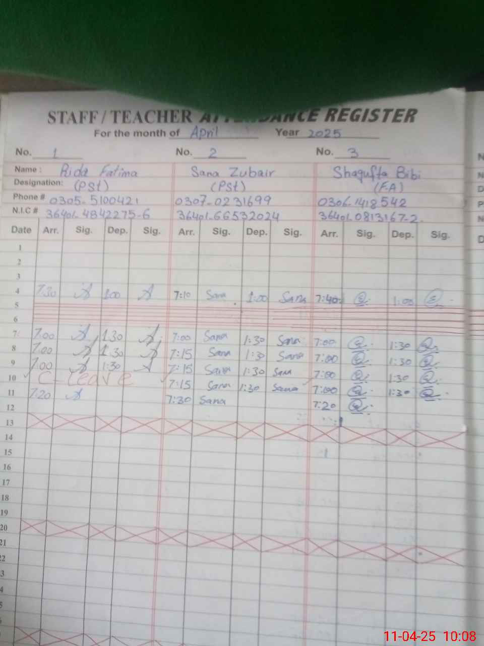 | CNIC | Full Name | Designation | R/C | Absence during last cal. month |