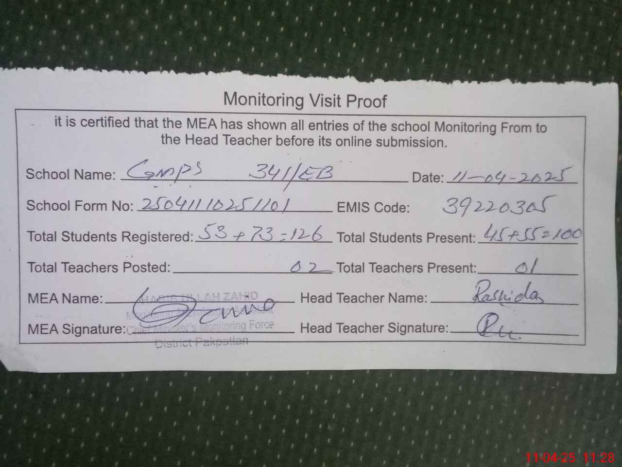 | Attendance Register | Head Teacher | MEA with School | Visit Proof |