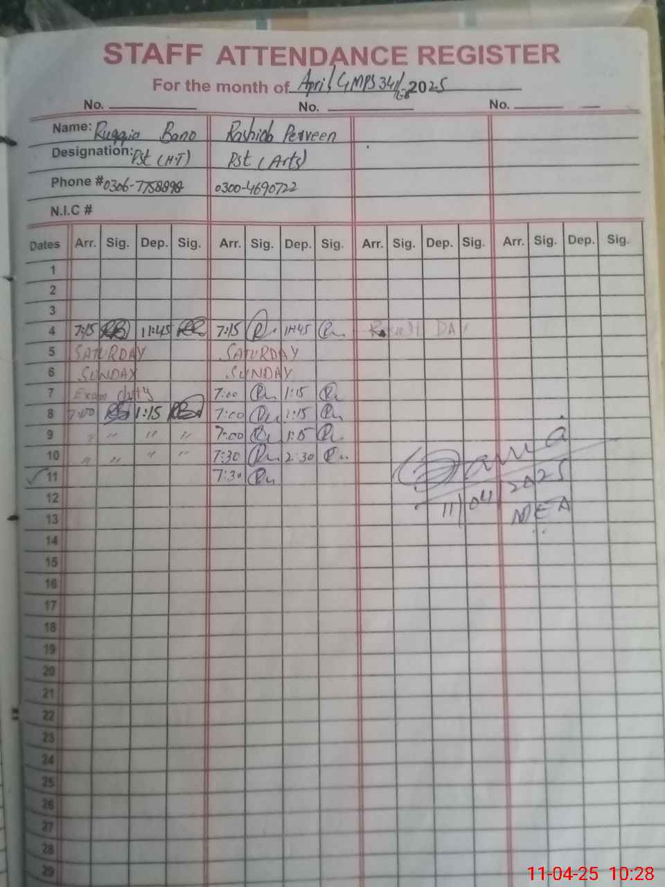 | Name: SA**** KH**** Designation: (School Headmaster's/Headmistress's) PST Phone/Cell Number: 03**** |