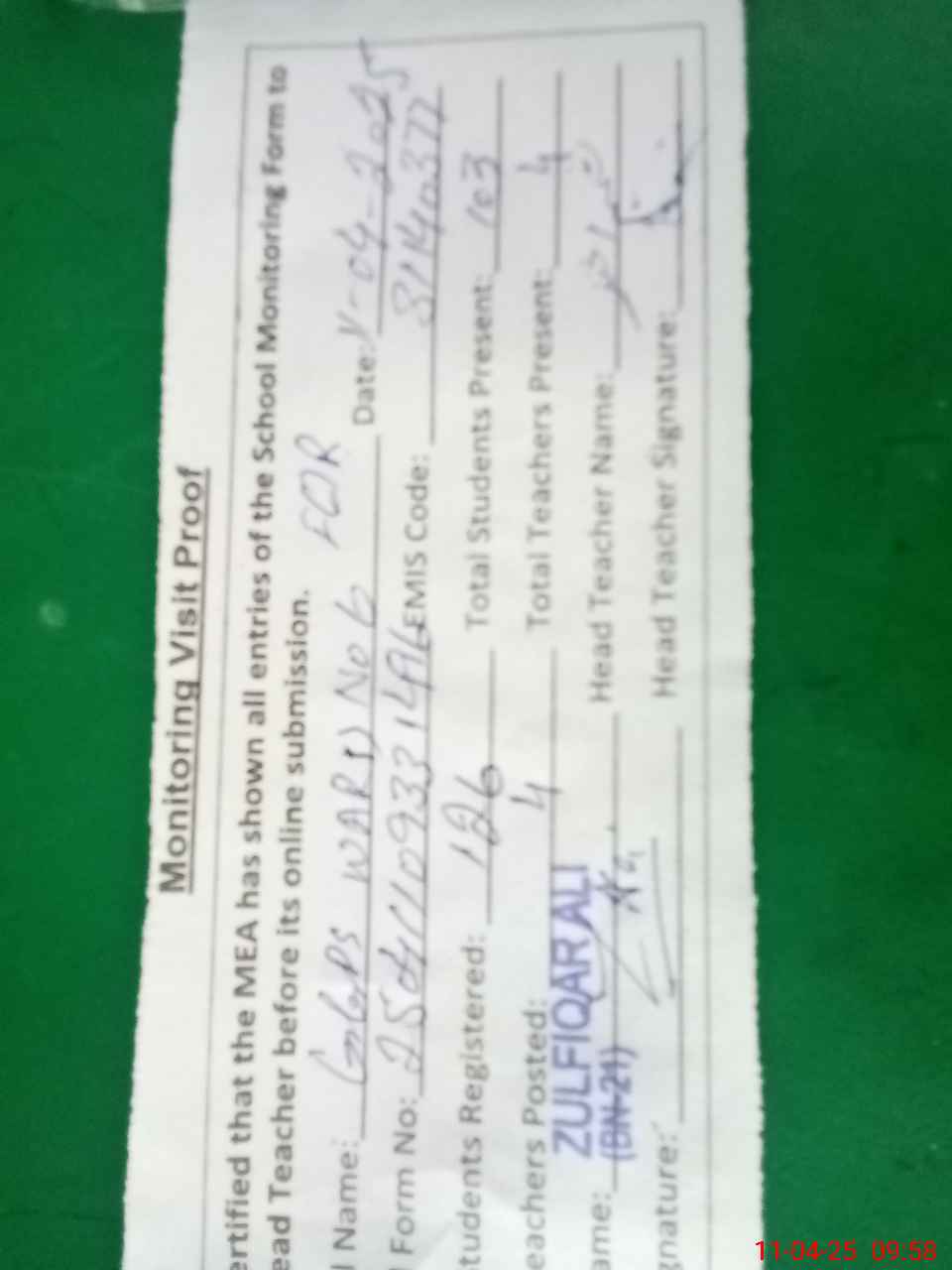 | Attendance Register | Head Teacher | MEA with School | Visit Proof |