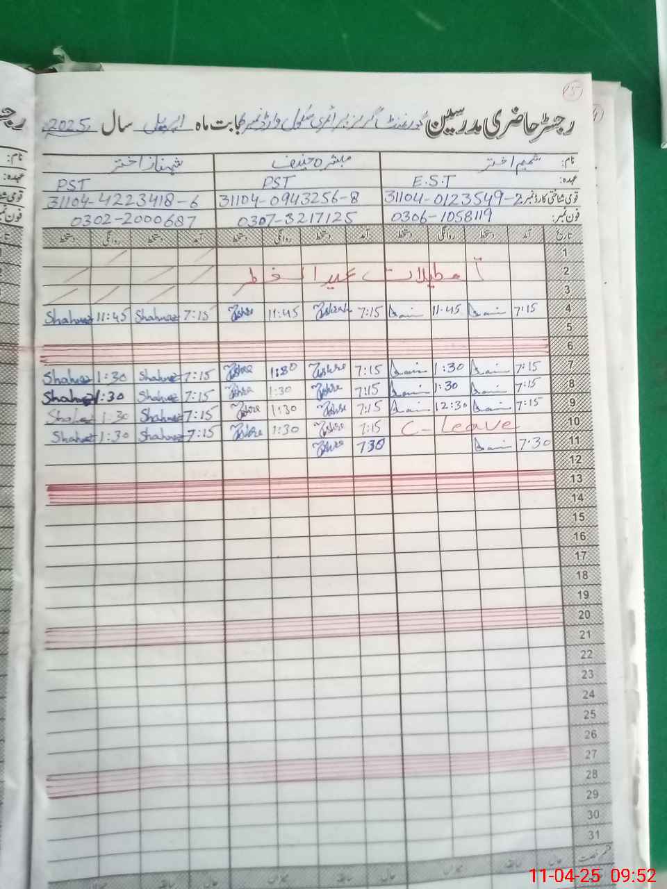 | CNIC | Full Name | Designation | R/C | Absence During Last Calender Month |