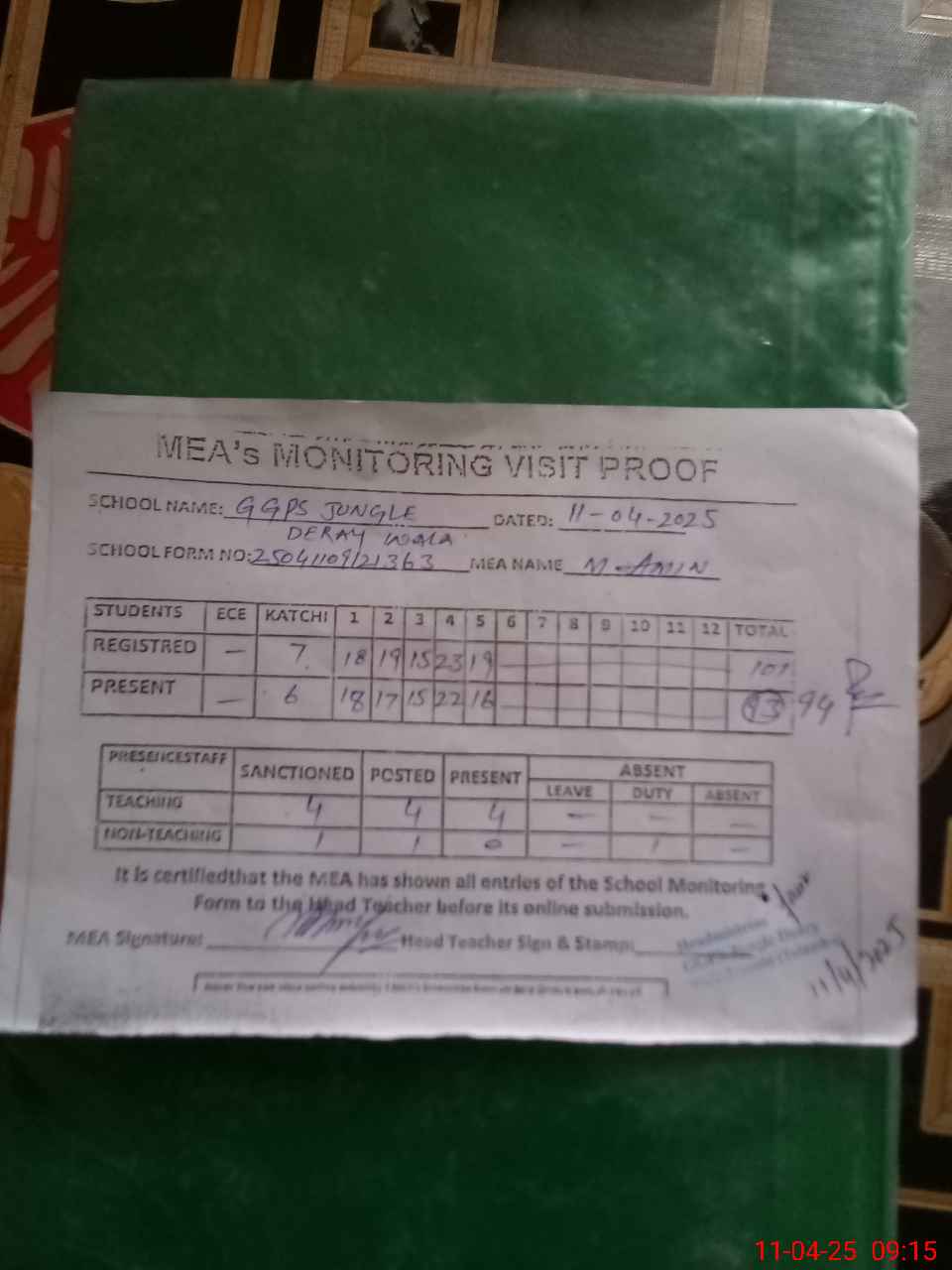 | Attendance Register | Head Teacher | MEA with School | Visit Proof |