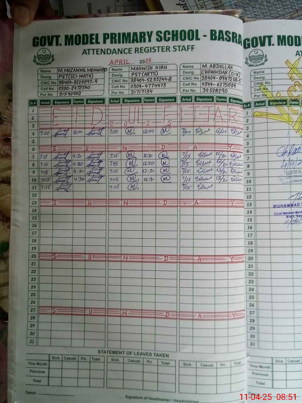 | Name: MU**** MU**** Designation: (School Headmaster's/Headmistress's) PST Phone/Cell Number: 03**** |