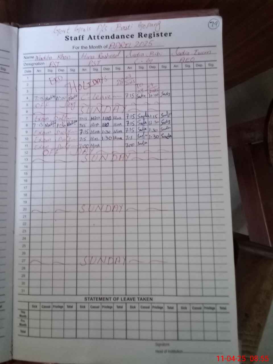 | Monitoring Date: 11-04-2025 | Start Time: 11-04-2025 08:54 AM | End Time: 11-04-2025 09:21 AM | Name of MEA: Kh**** Fa**** | |