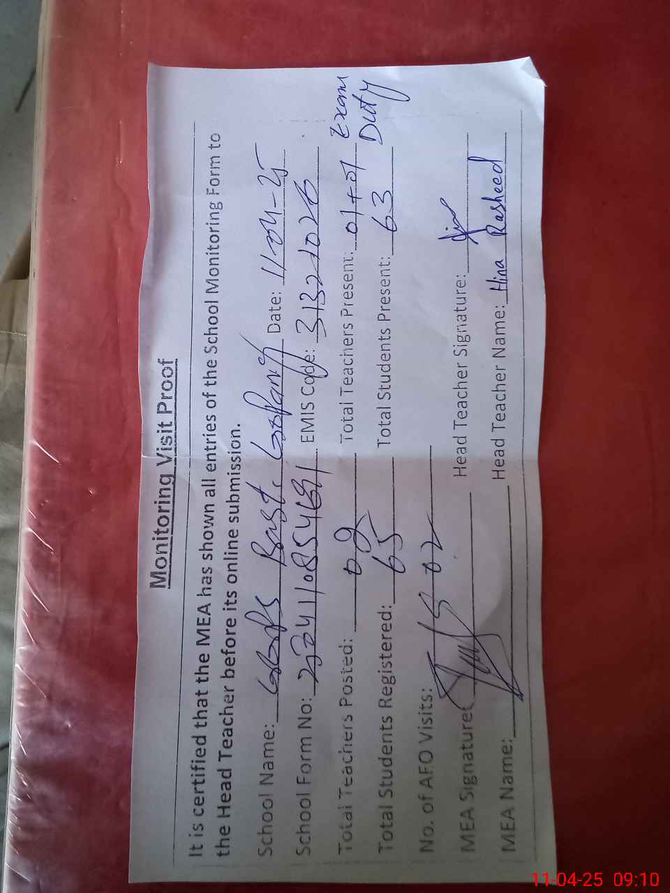 | Attendance Register | Head Teacher | MEA with School | Visit Proof |