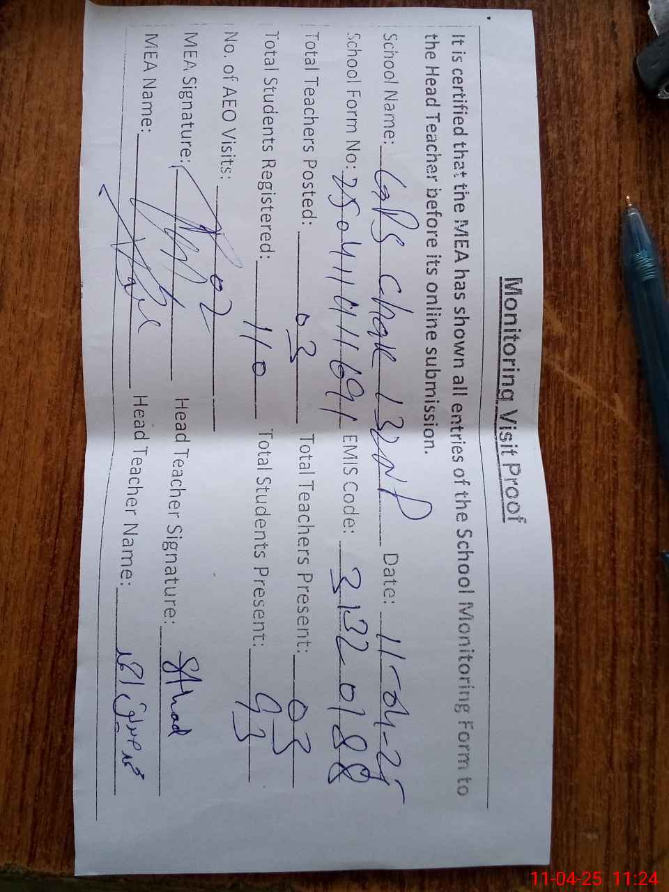 | Attendance Register | Head Teacher | MEA with School | Visit Proof |