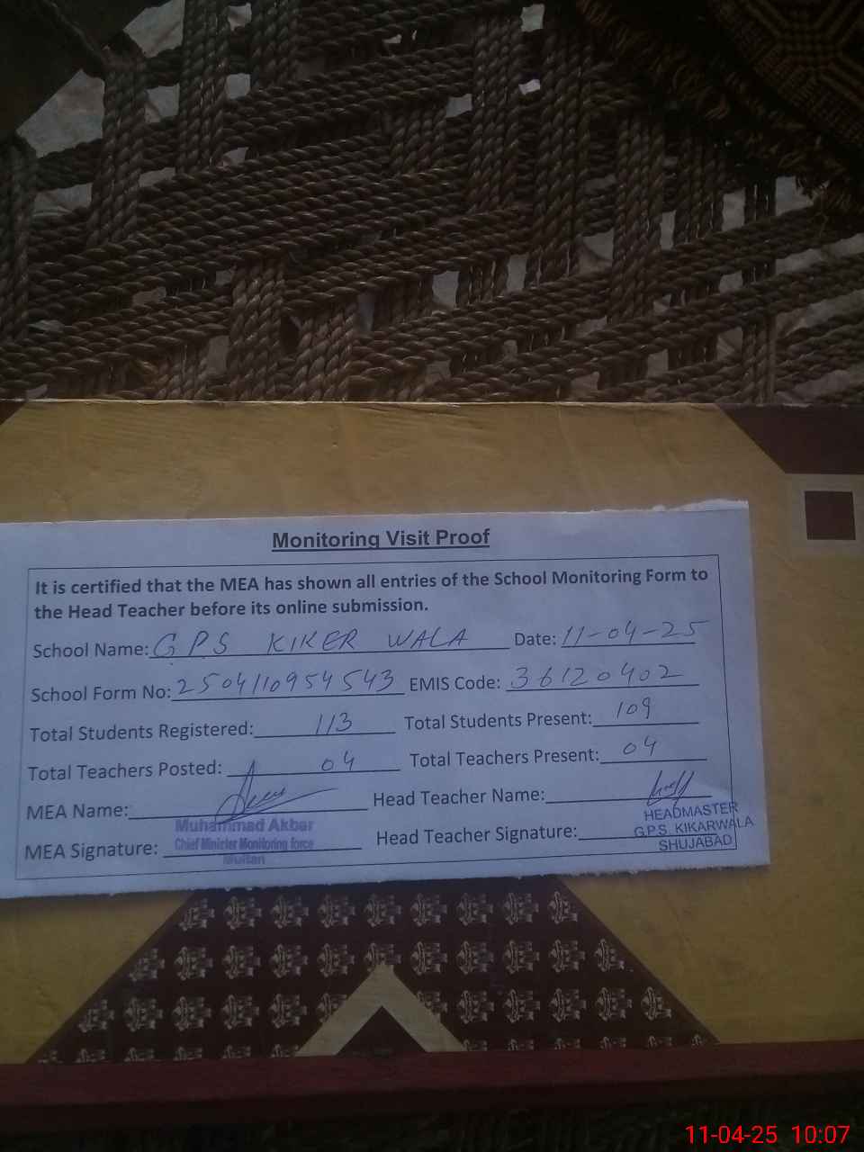 | Monitoring Date: 11-04-2025 | Start Time: 11-04-2025 09:50 AM | End Time: 11-04-2025 10:39 AM | Name of MEA: MU**** AK**** | |