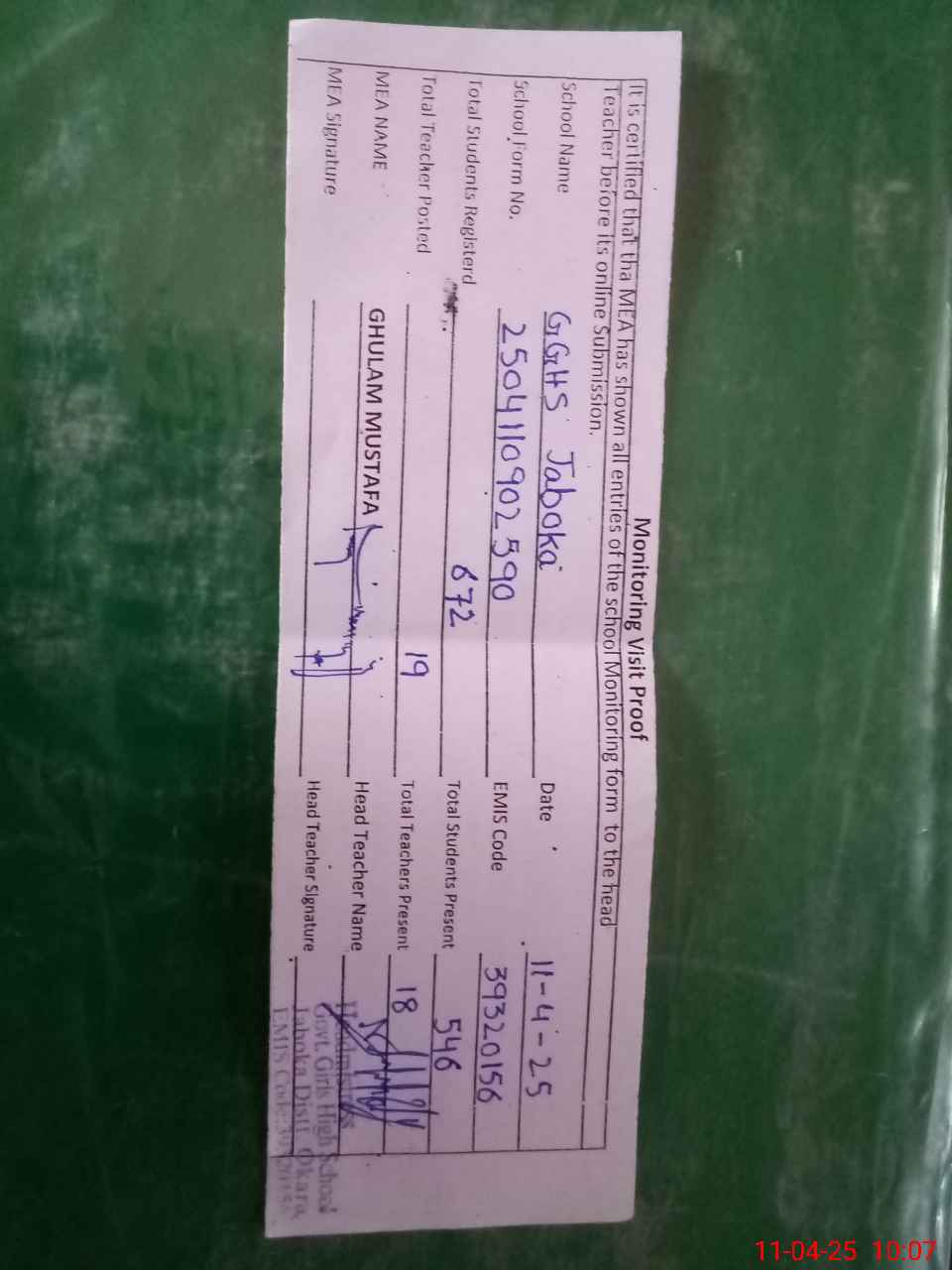 | Certified that this School was Inspected by the Undersigned MEA/DMO Today and the Information Stated Above is as Per Record. | |||||