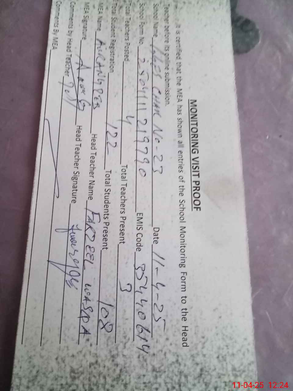 | Attendance Register | Head Teacher | MEA with School | Visit Proof |