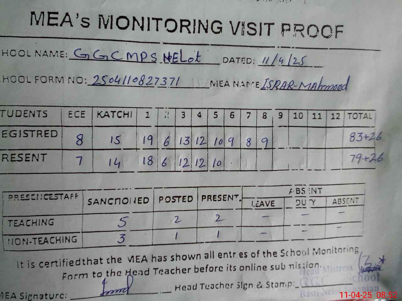 | Attendance Register | Head Teacher | MEA with School | Visit Proof |
