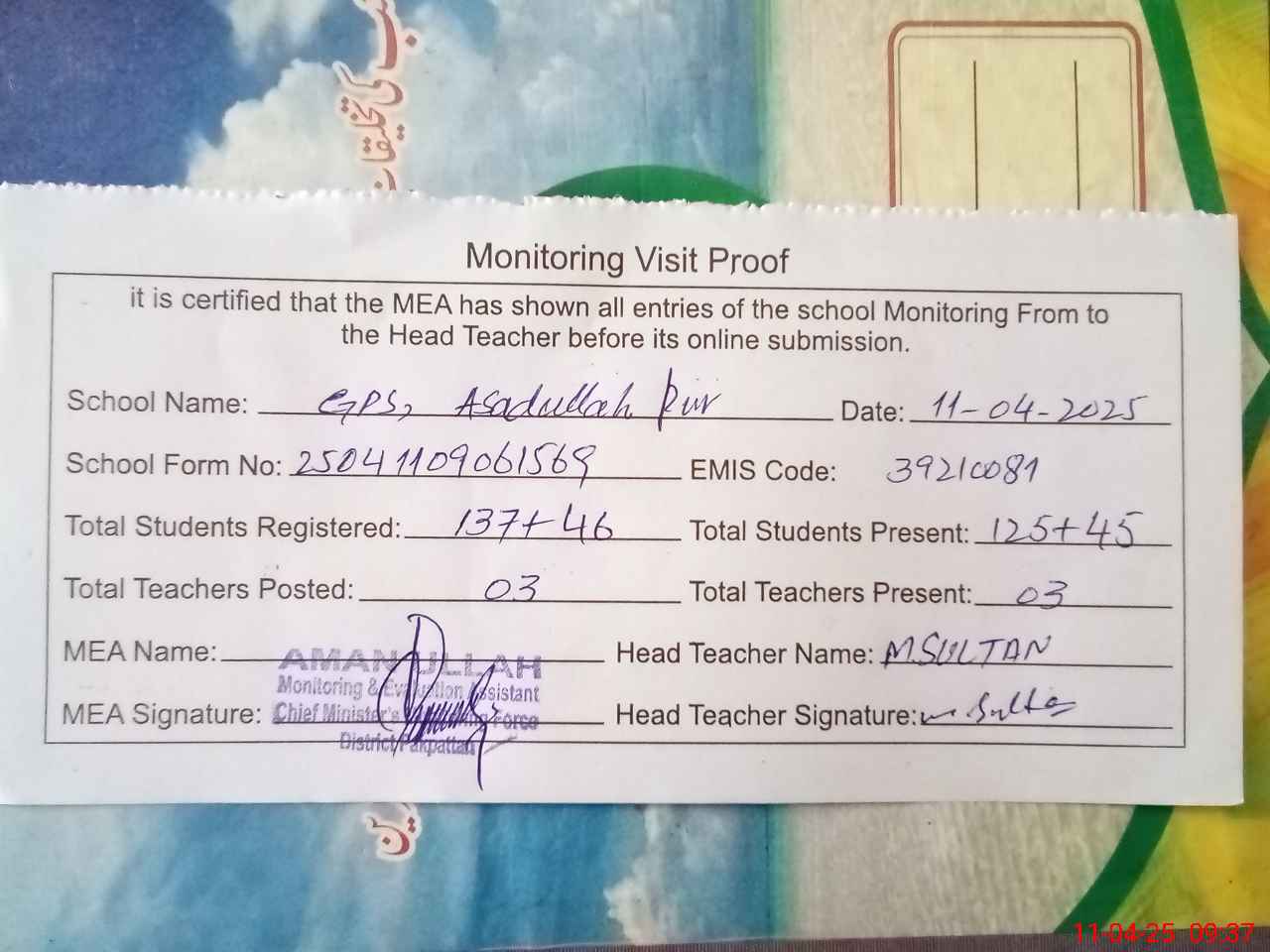 | Attendance Register | Head Teacher | MEA with School | Visit Proof |