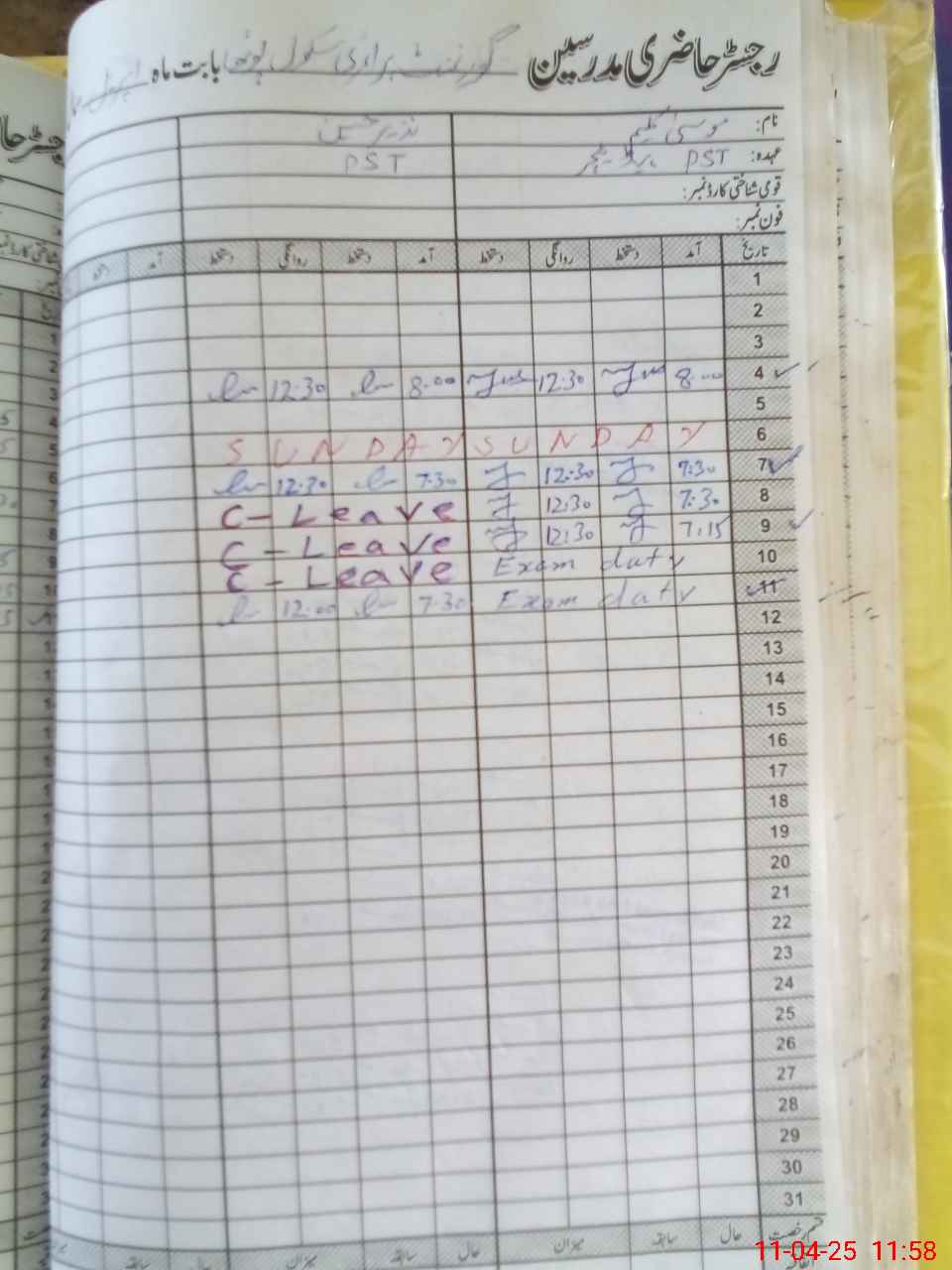 | 36**** | Mu**** Ka**** | PST | Regular | 0 | 0 | 0 | 0 | 0 | 0 | 0 | 0 | 0 | Exam Duty |