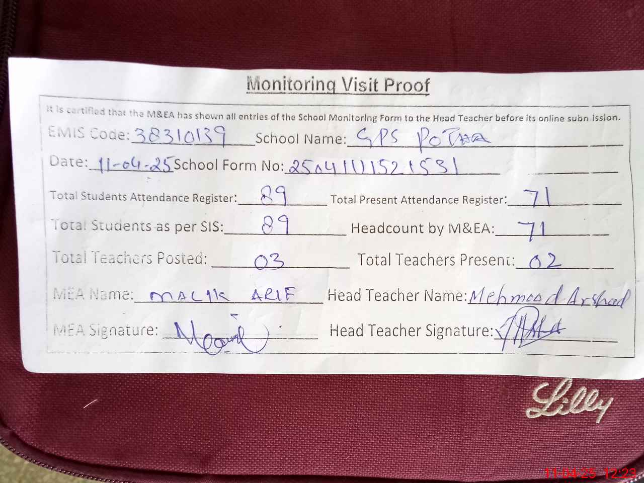 | Attendance Register | Head Teacher | MEA with School | Visit Proof |