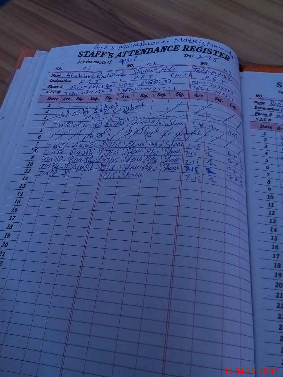 | CNIC | Full Name | Designation | R/C | Absence during last cal. month |