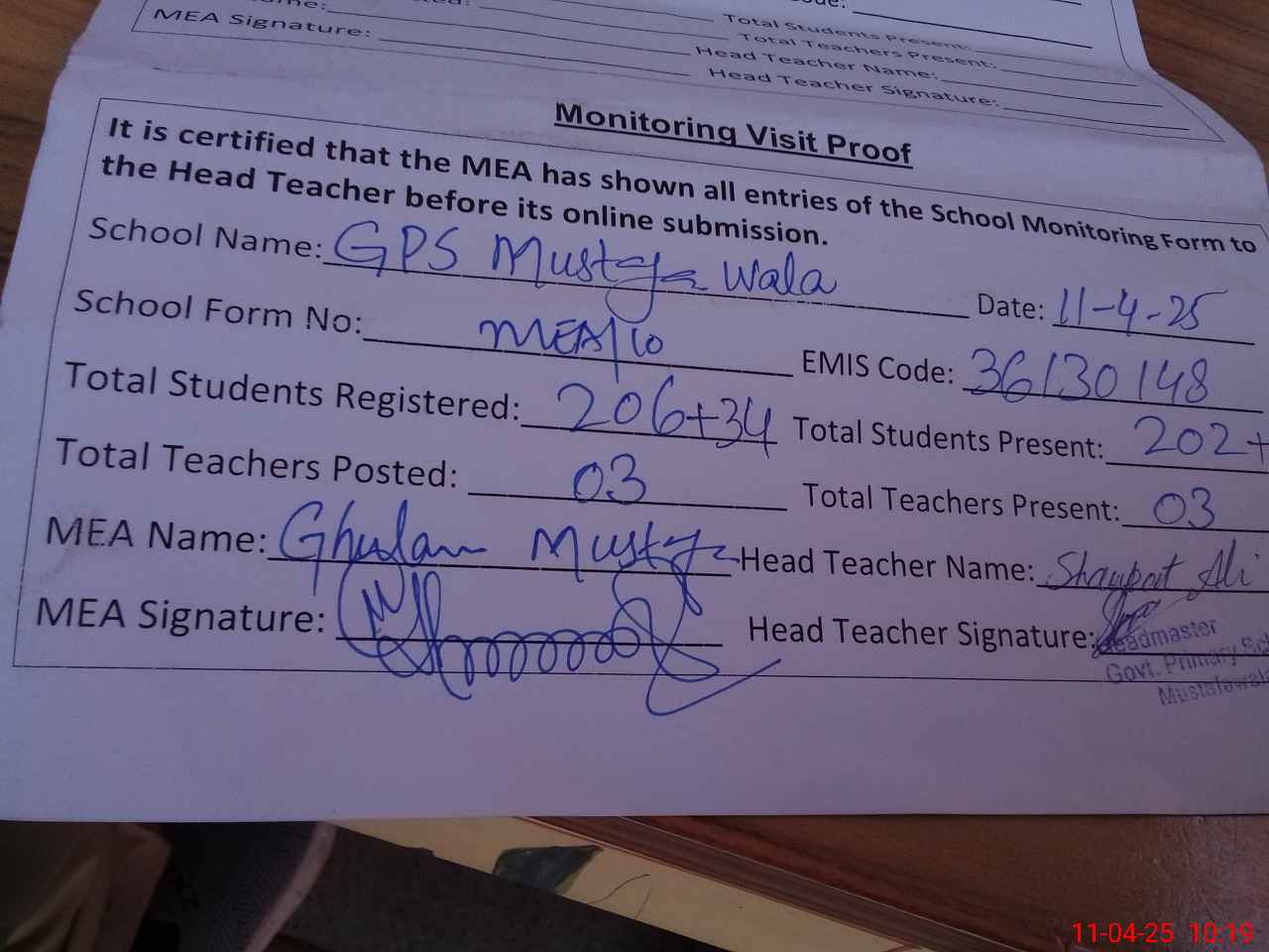 | Attendance Register | Head Teacher | MEA with School | Visit Proof |