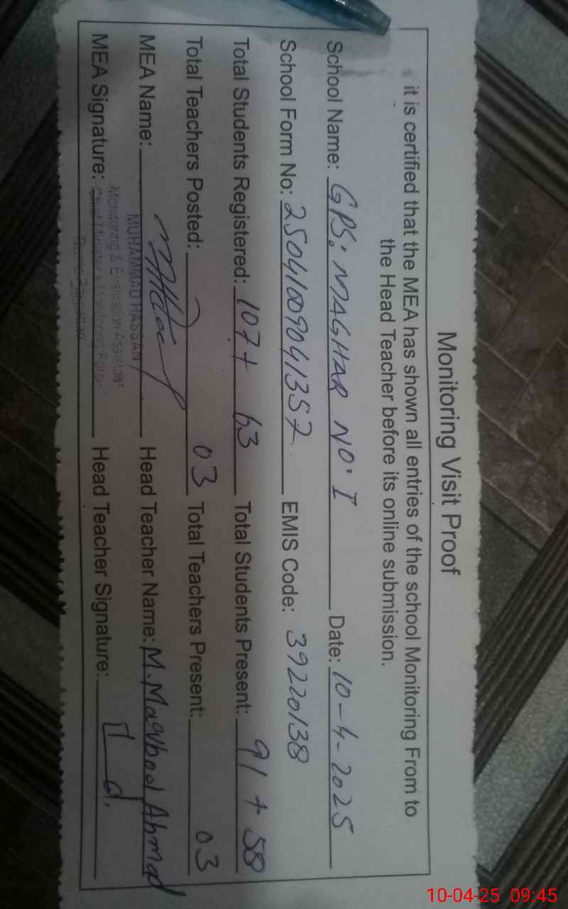 | EMIS Code: 39220138 | Name of School: GPS MAGHER NO. 1 | |||