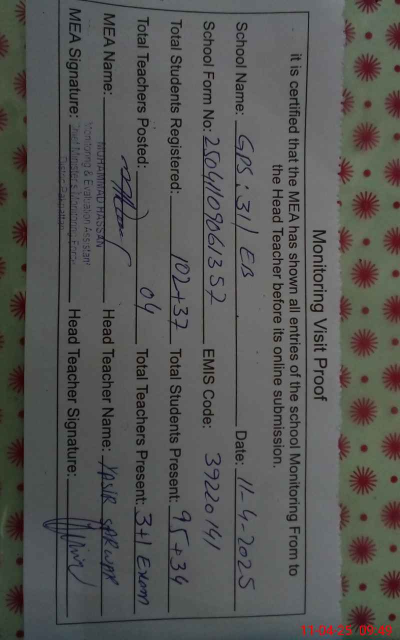 | EMIS Code: 39220141 | Name of School: GPS CHAK NO. 31 EB | |||