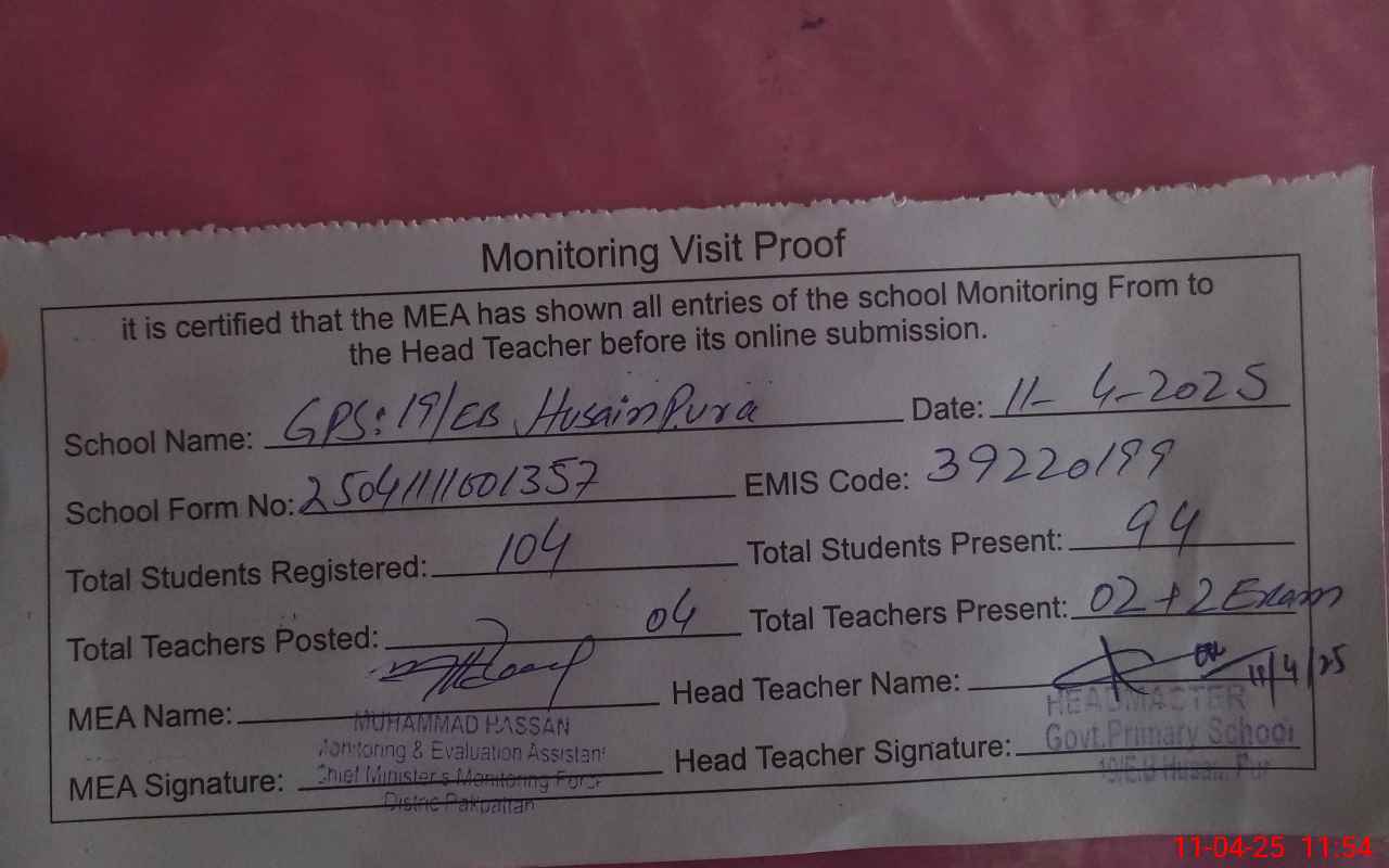 | EMIS Code: 39220199 | Name of School: GPS 19 EB HUSSAIN PUR | |||
