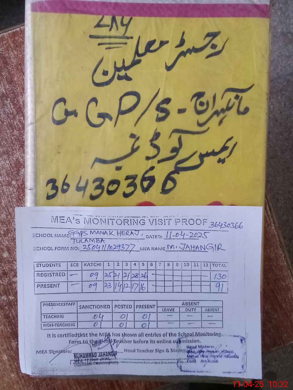 | EMIS Code: 36430366 | Name of School: GGPS MANAK HERAJ, TULAMBA | |||