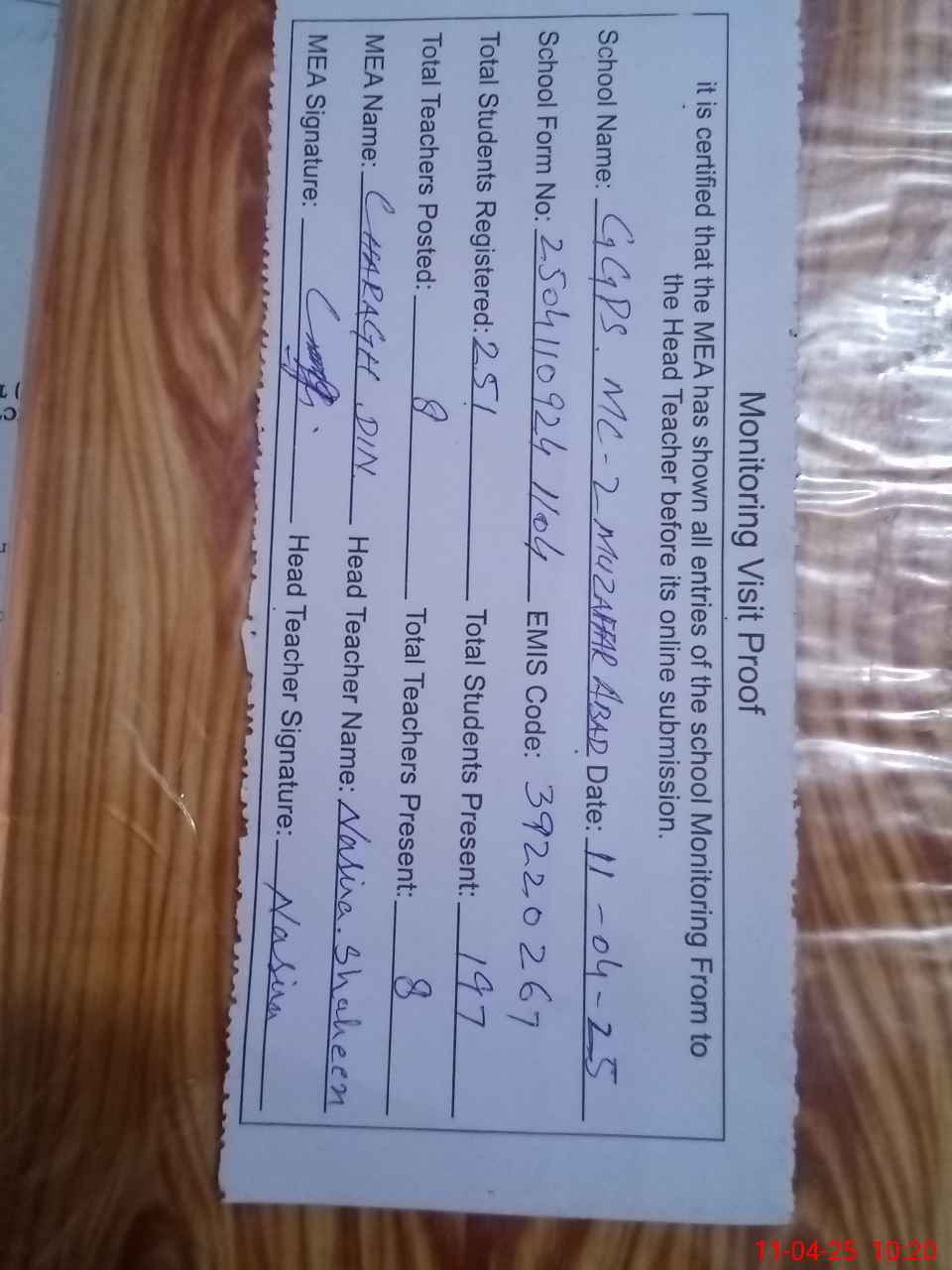 | Attendance Register | Head Teacher | MEA with School | Visit Proof |