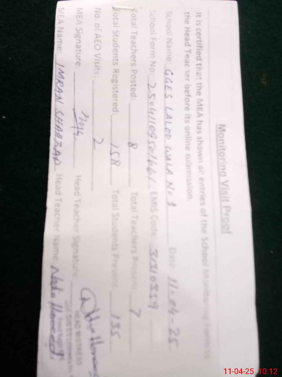 | Attendance Register | Head Teacher | MEA with School | Visit Proof |