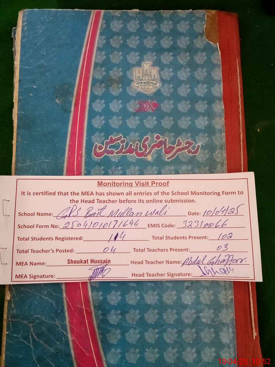 | Attendance Register | Head Teacher | MEA with School | Visit Proof |