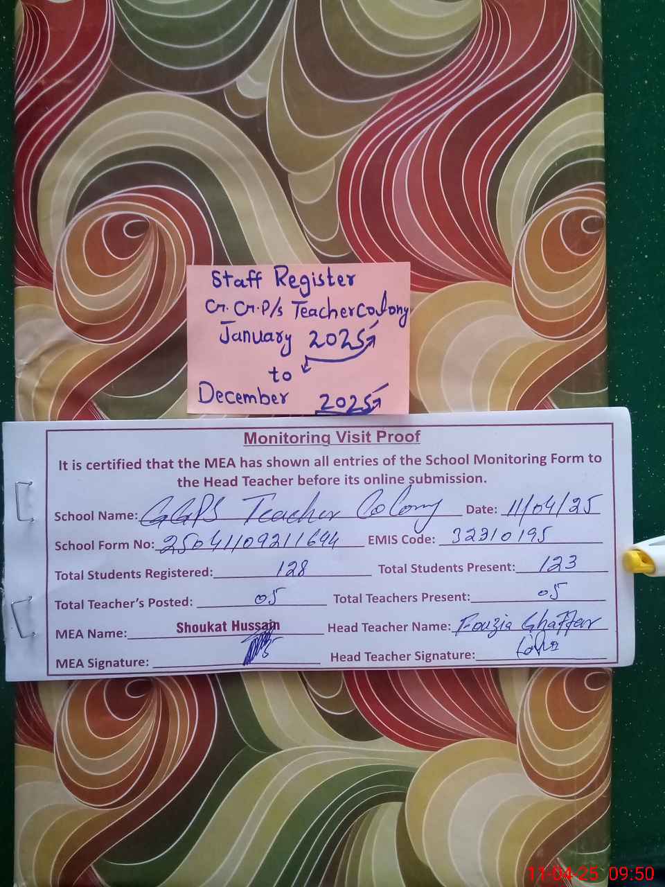 | Attendance Register | Head Teacher | MEA with School | Visit Proof |