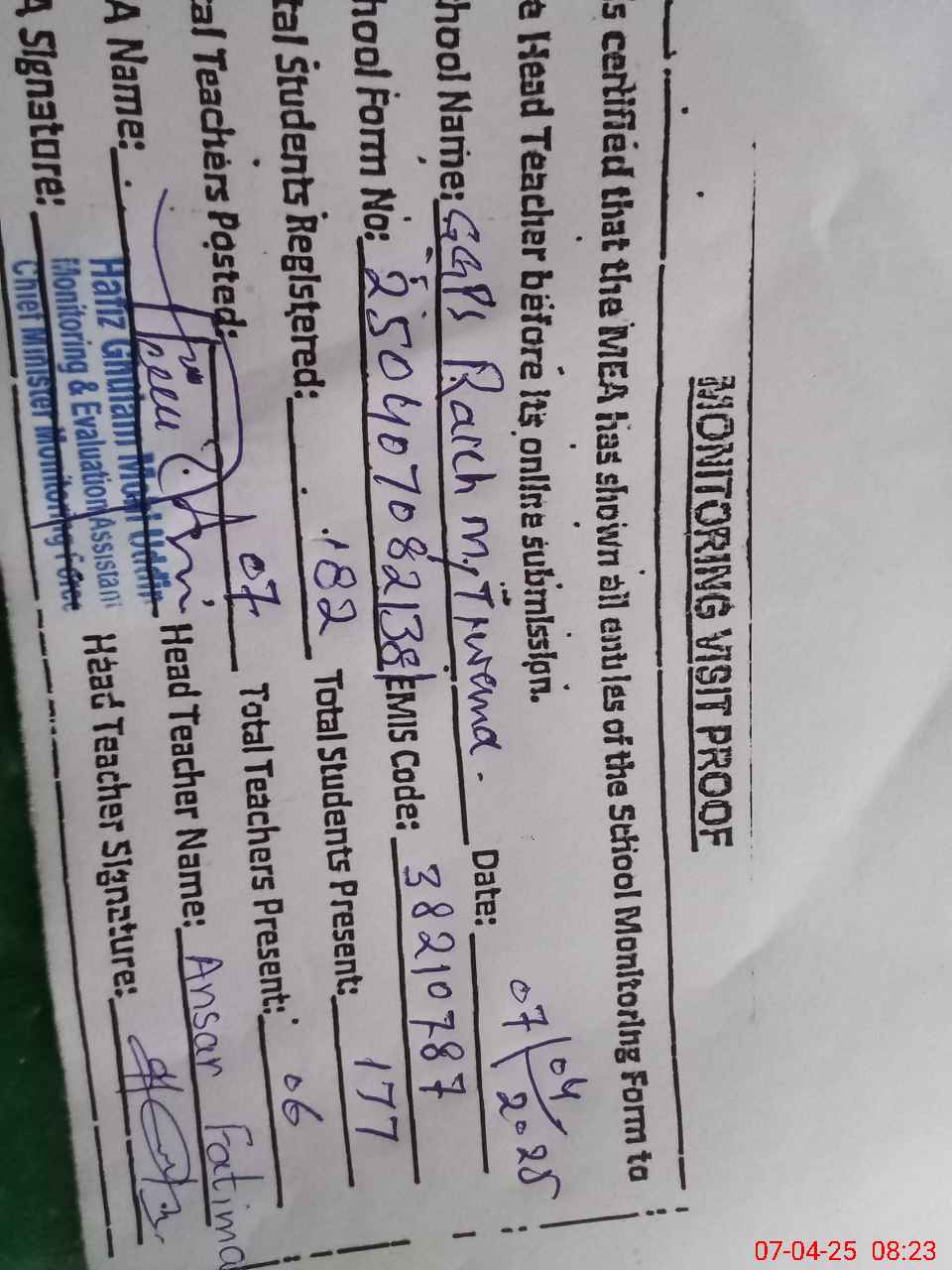 | Attendance Register | Head Teacher | MEA with School | Visit Proof |