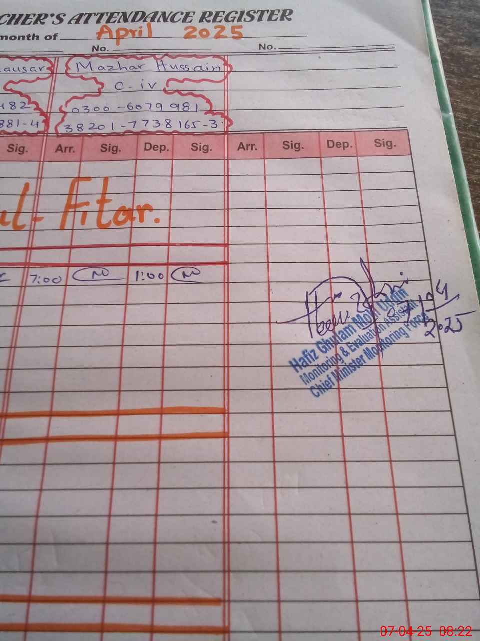 | Monitoring Date: 07-04-2025 | Start Time: 07-04-2025 07:49 AM | End Time: 07-04-2025 08:26 AM | Name of MEA: HA**** GH**** MO**** UDDI**** | |