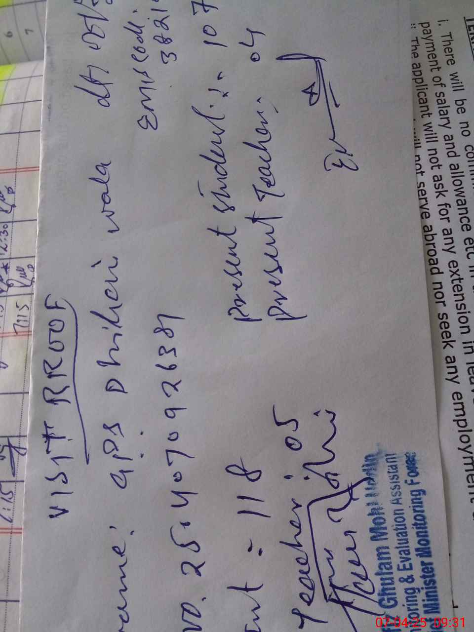 | Monitoring Date: 07-04-2025 | Start Time: 07-04-2025 08:45 AM | End Time: 07-04-2025 09:33 AM | Name of MEA: HA**** GH**** MO**** UDDI**** | |