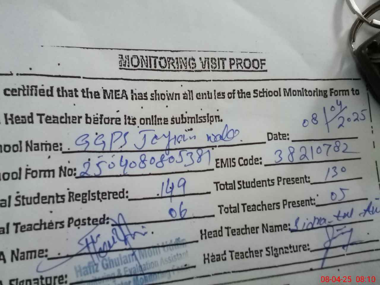 | Attendance Register | Head Teacher | MEA with School | Visit Proof |