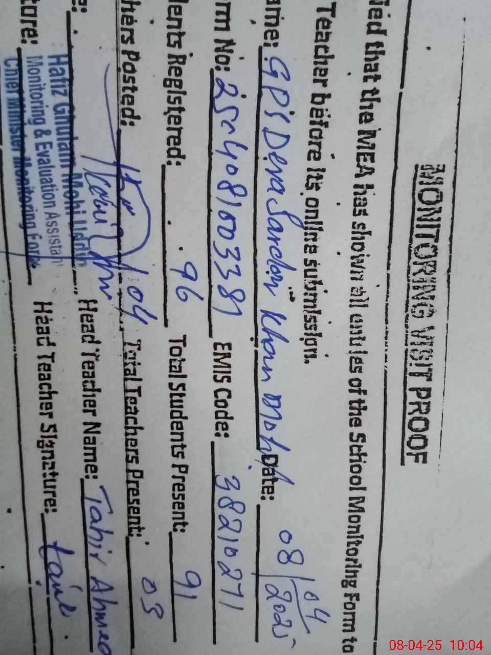 | EMIS Code: 38210271 | Name of School: GPS DERA SARDAR KHAN MAHIL | |||