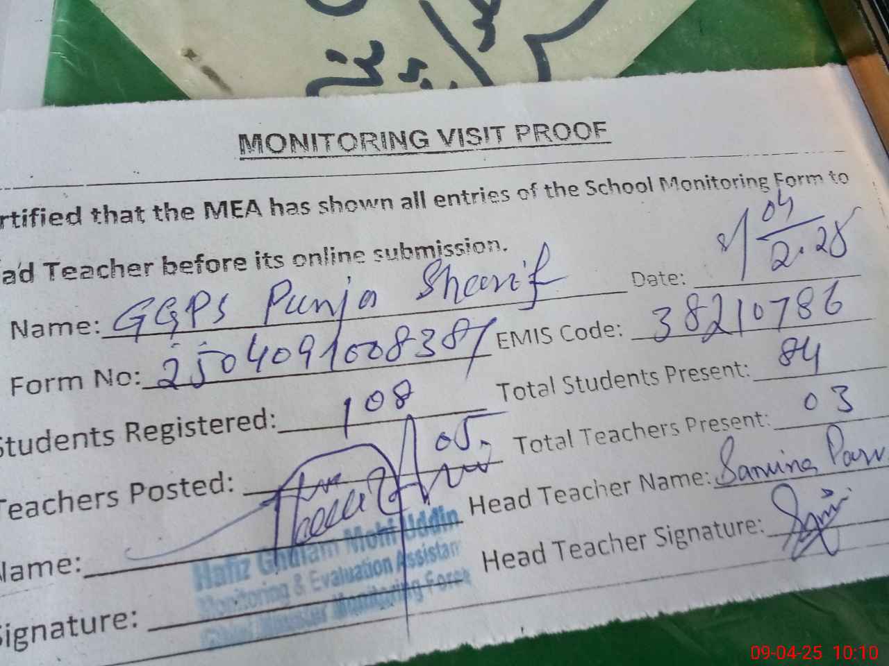 | EMIS Code: 38210786 | Name of School: GGPS PUNJA SHARIF | |||