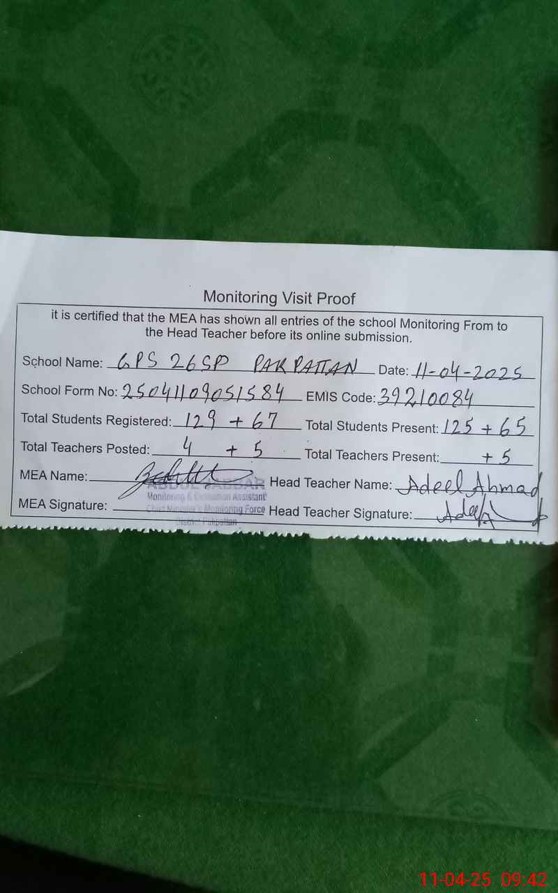 | EMIS Code: 39210084 | Name of School: GPS 26/SP PAKPATTAN | |||