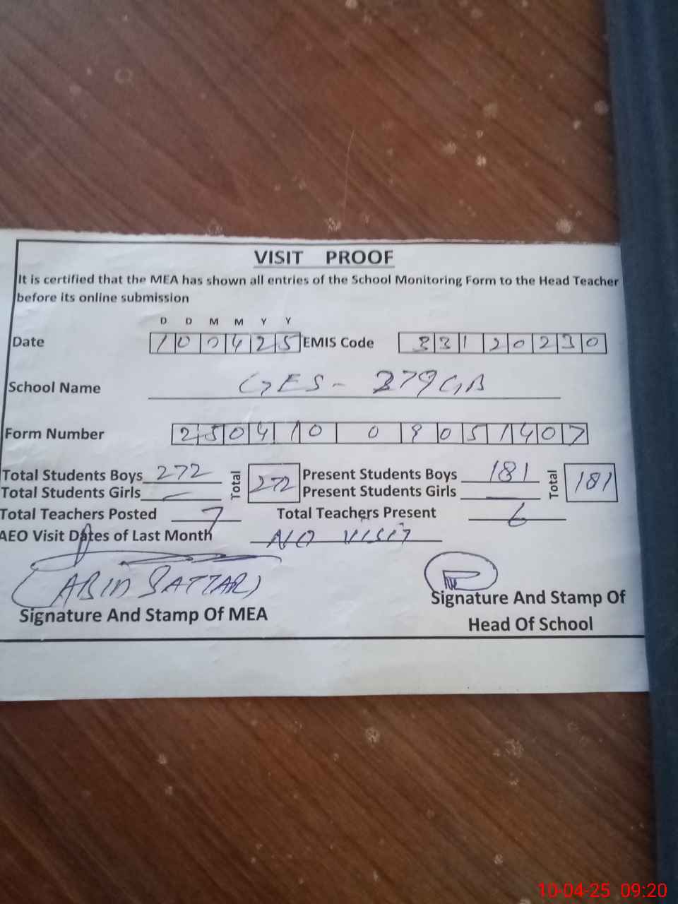 | Attendance Register | Head Teacher | MEA with School | Visit Proof |