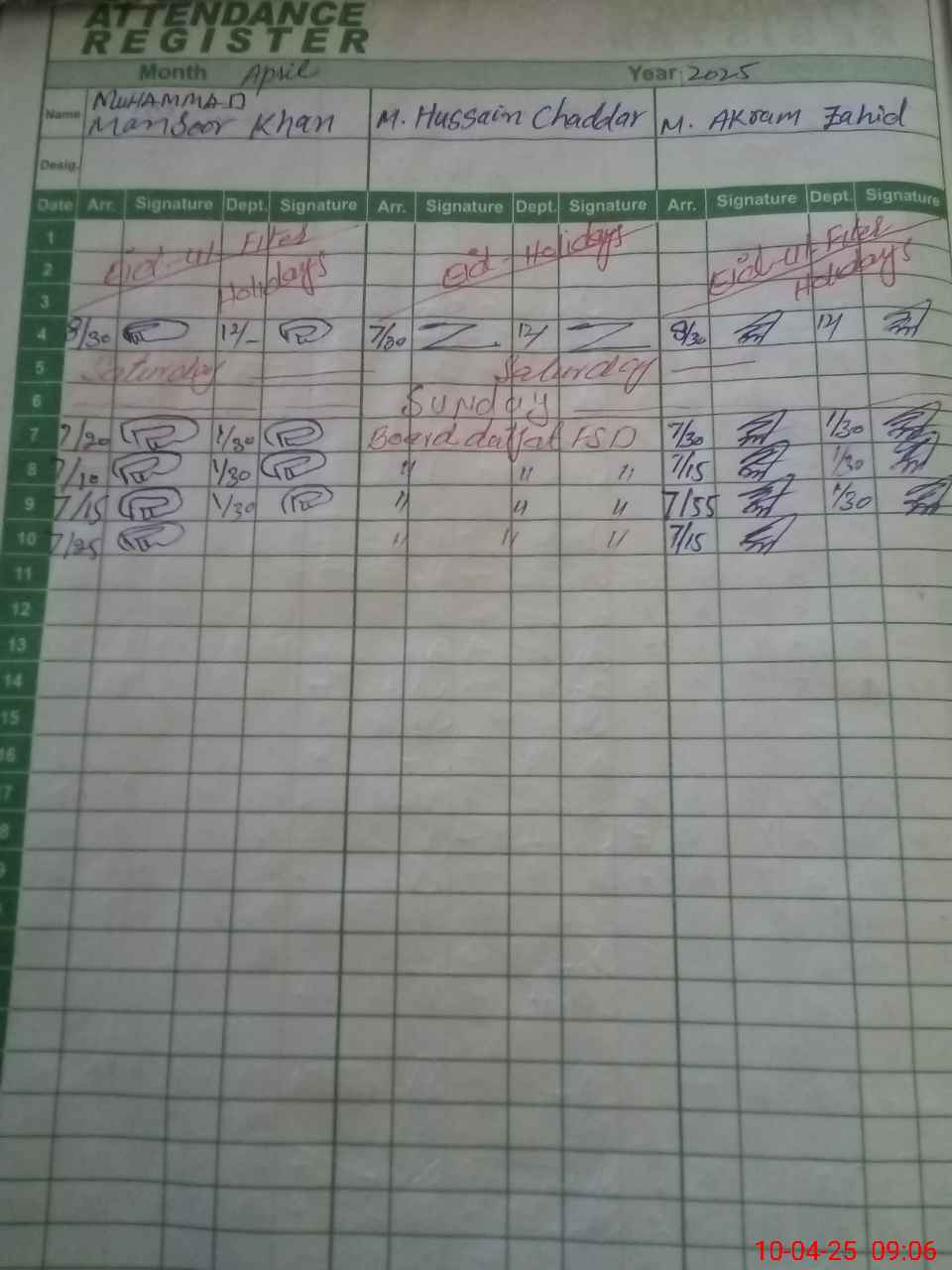 | CNIC | Full Name | Designation | R/C | Absence During Last Calender Month |