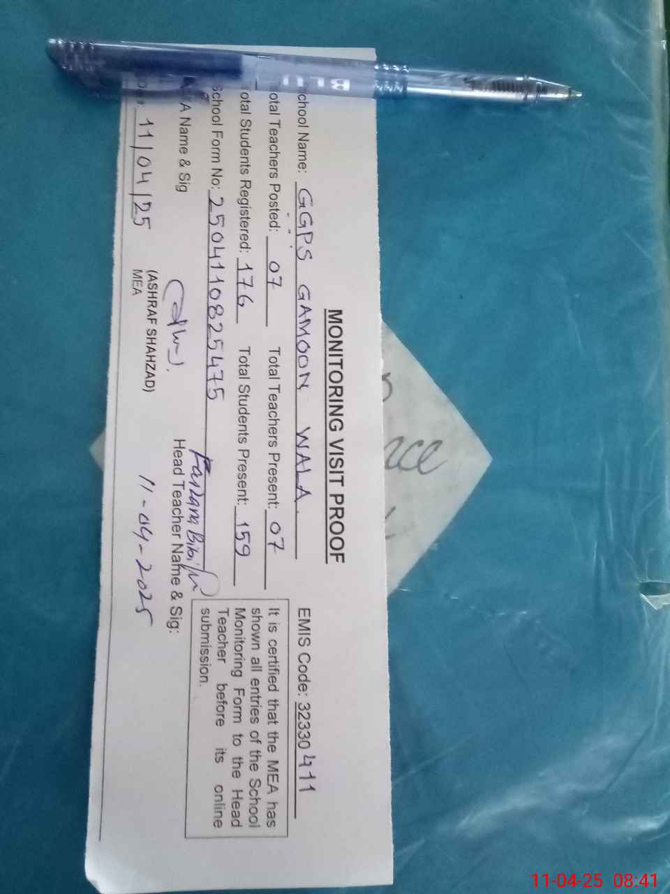 | Attendance Register | Head Teacher | MEA with School | Visit Proof |