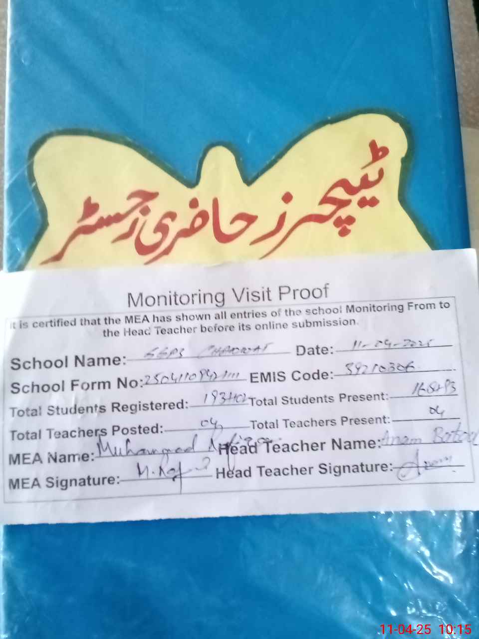 | Attendance Register | Head Teacher | MEA with School | Visit Proof |