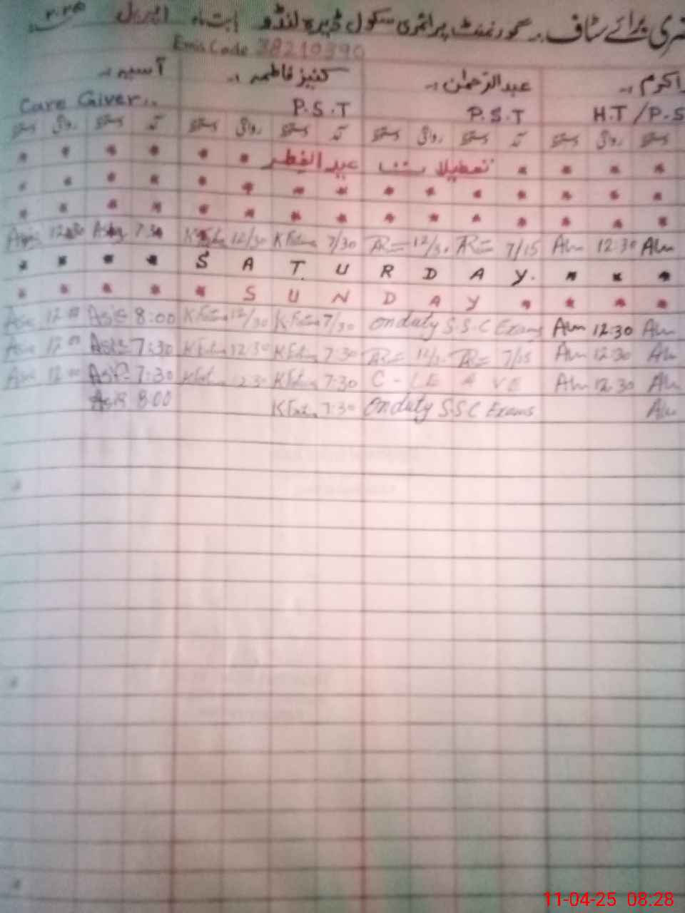 | 38**** | Ab**** Re**** | PST | Regular | 0 | 0 | 0 | 0 | 0 | 0 | 0 | 0 | 0 | Exam Duty |