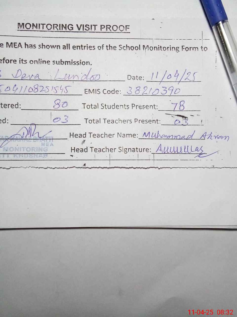 | Attendance Register | Head Teacher | MEA with School | Visit Proof |