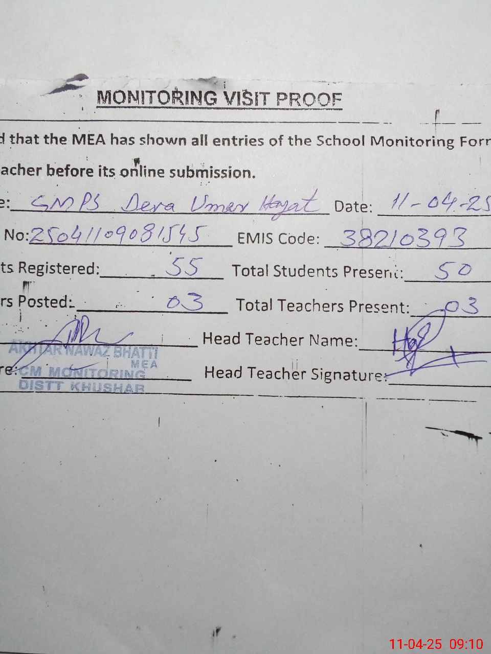 | Attendance Register | Head Teacher | MEA with School | Visit Proof |