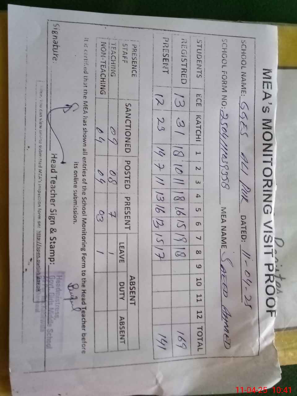 | Attendance Register | Head Teacher | MEA with School | Visit Proof |