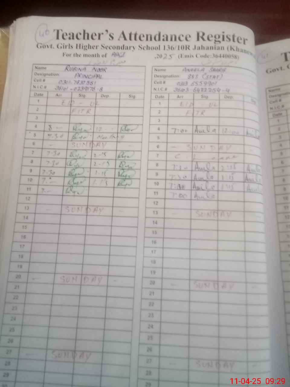 | CNIC | Full Name | Designation | R/C | Absence During Last Calender Month |