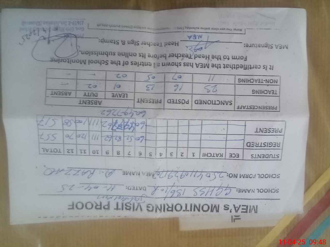 | Attendance Register | Head Teacher | MEA with School | Visit Proof |