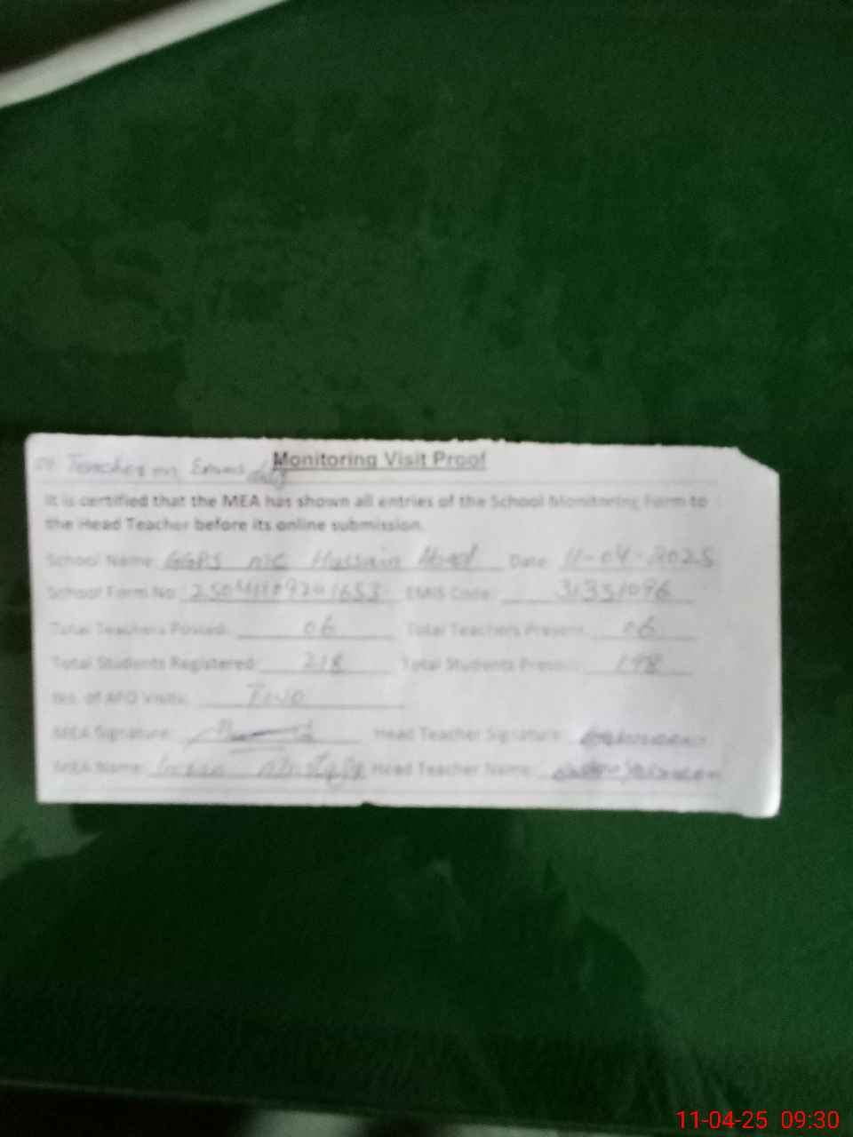 | Attendance Register | Head Teacher | MEA with School | Visit Proof |